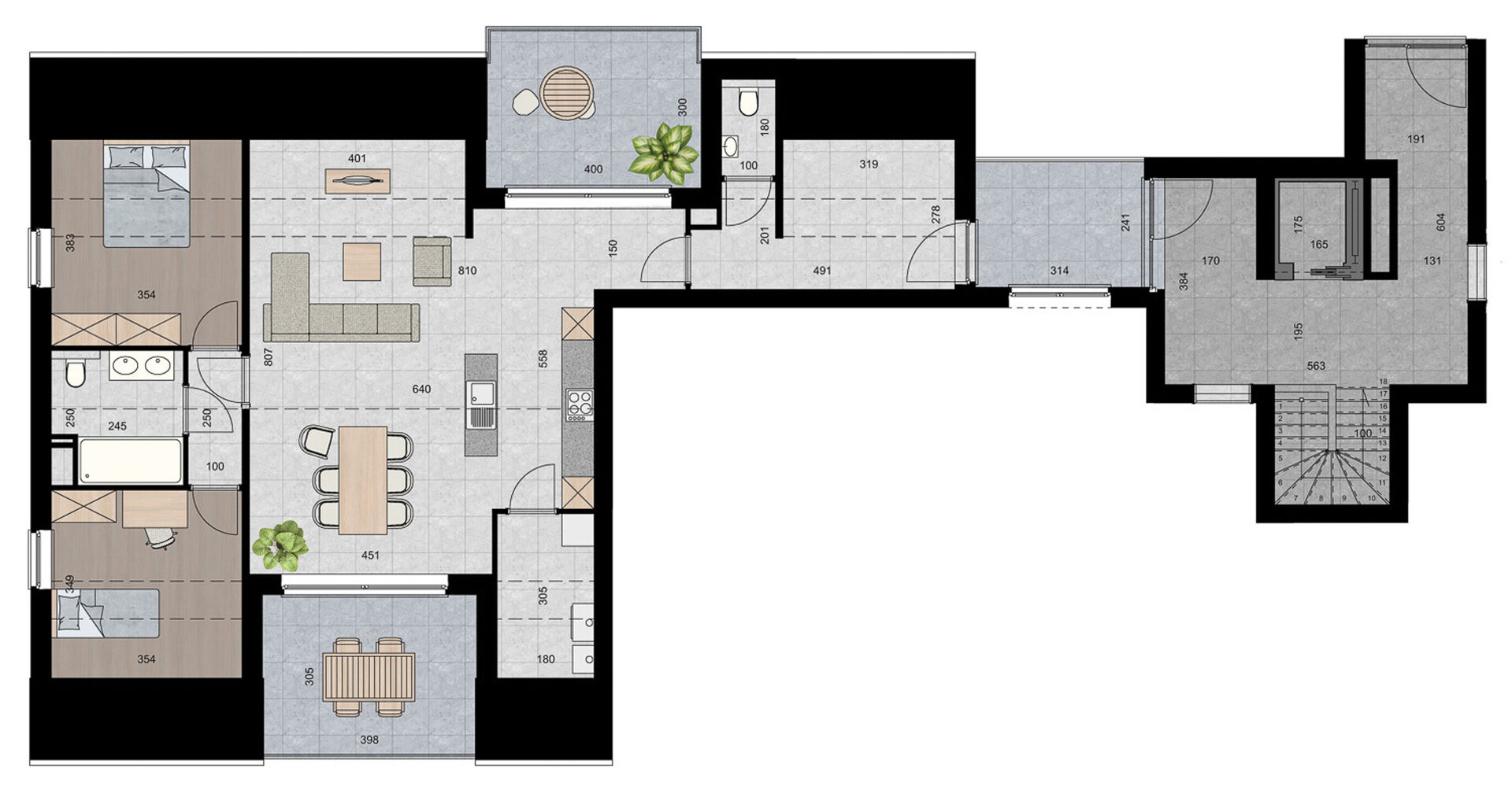 Inkomhal, toilet, woonkamer, keuken, nachthal, 2 slaapkamers, wasplaats, badkamer, 2 terrassen