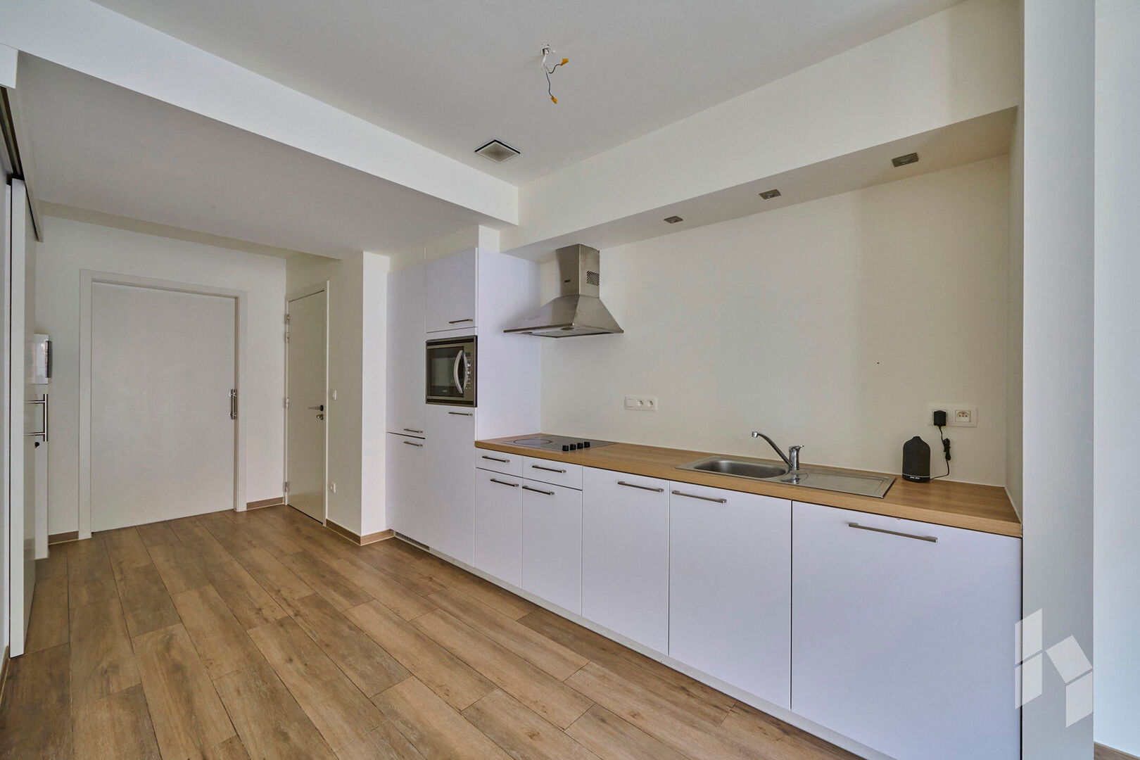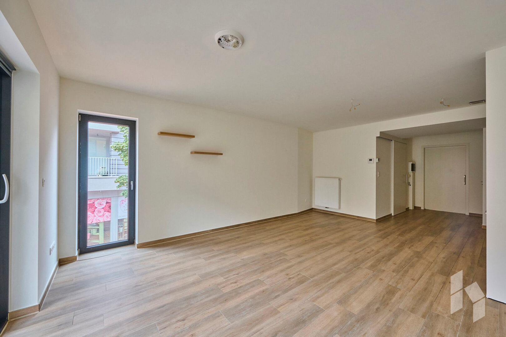 Verdieping 1: Inkom, slaapkamer, badkamer, living met keuken en terras.