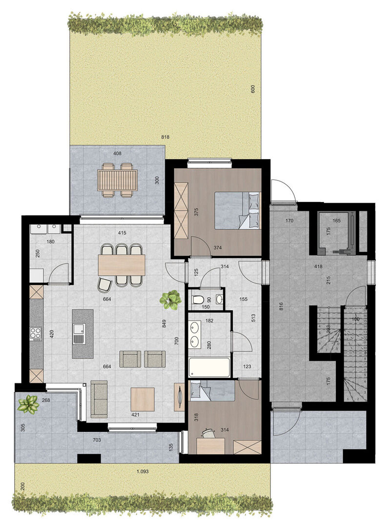 Inkomhal, toilet, woonkamer, keuken, 2 slaapkamers, wasplaats, badkamer, 2 terrassen, tuin