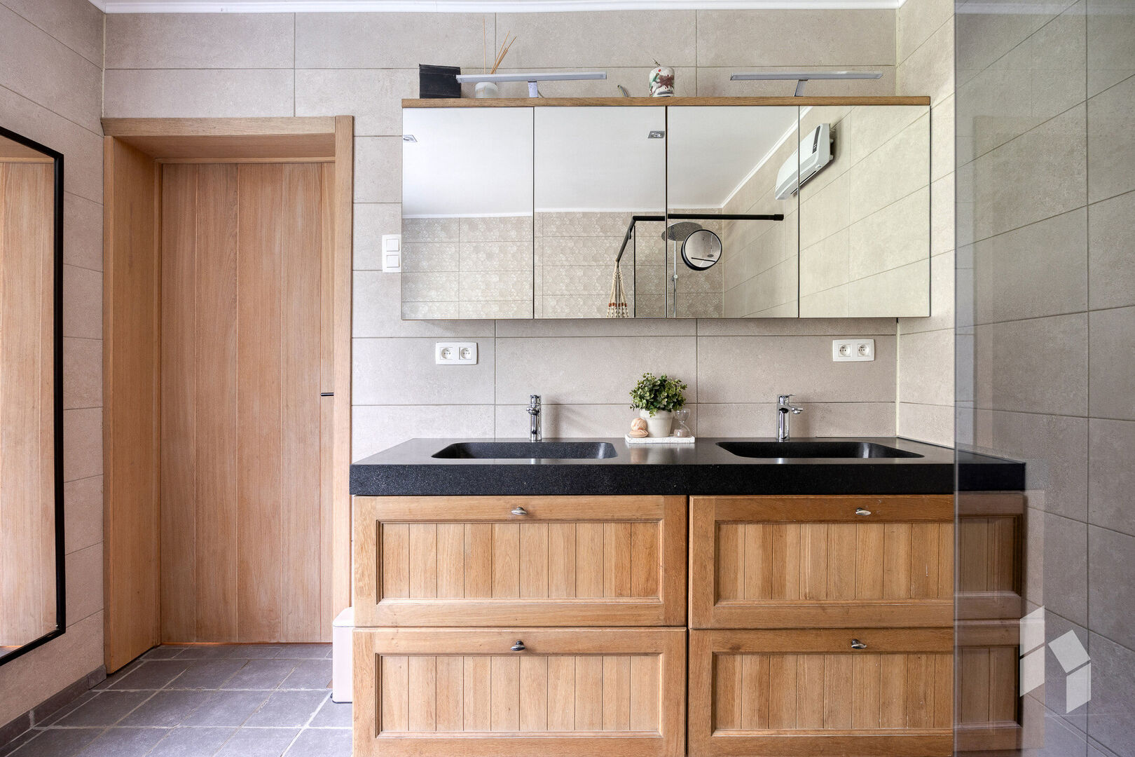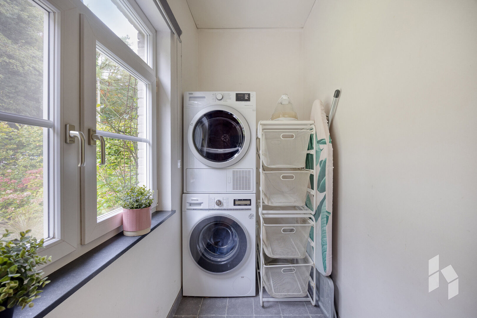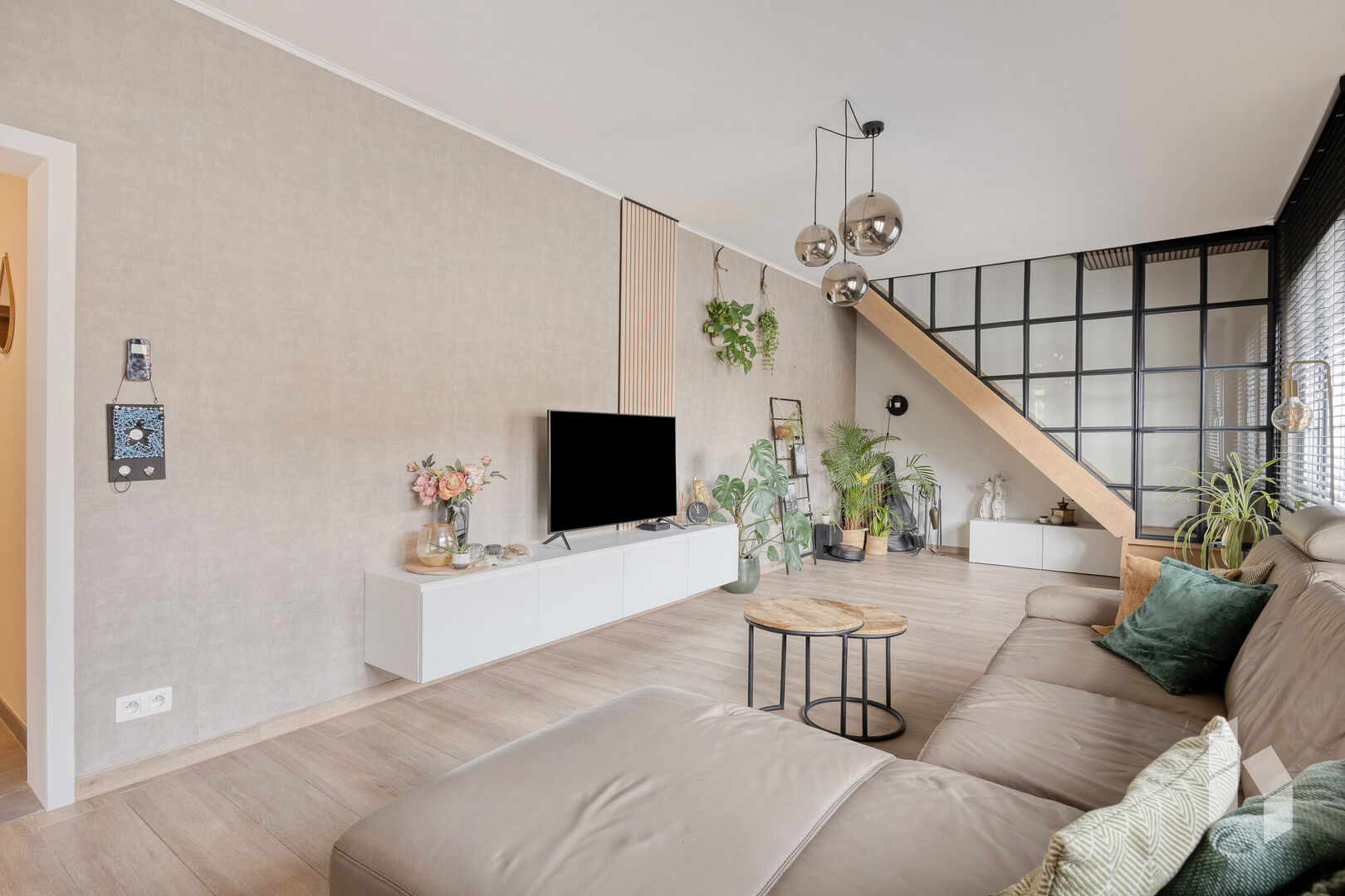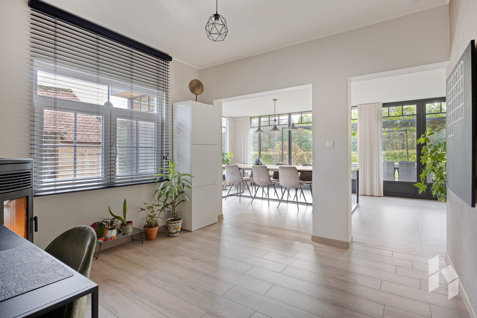 Gelijkvloers is er een gezellig ingerichte woonkamer aanwezig dewelke grenst aan een mooie lichtrijke leefruimte, deze is opgedeeld in een bureaugedeelte, een ruime eetkamer en een prachtige, open keuken met zicht op de tuin.