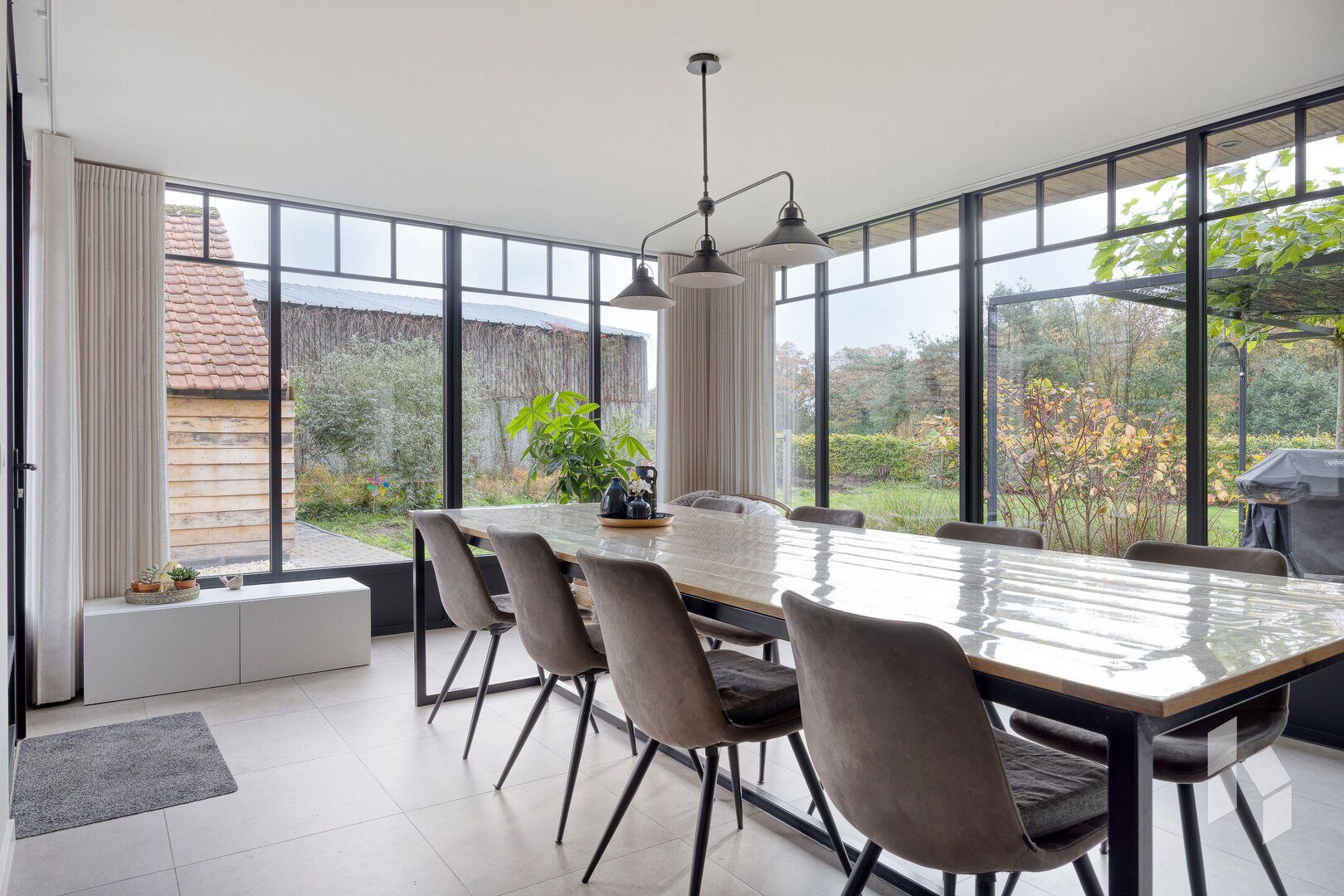 Gelijkvloers is er een gezellig ingerichte woonkamer aanwezig dewelke grenst aan een mooie lichtrijke leefruimte, deze is opgedeeld in een bureaugedeelte, een ruime eetkamer en een prachtige, open keuken met zicht op de tuin.