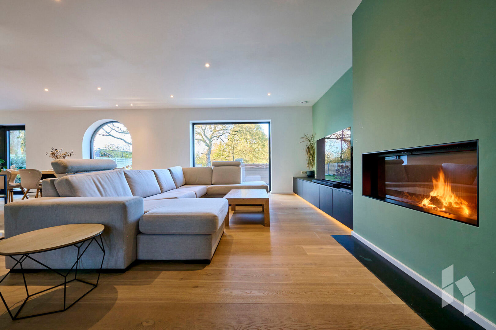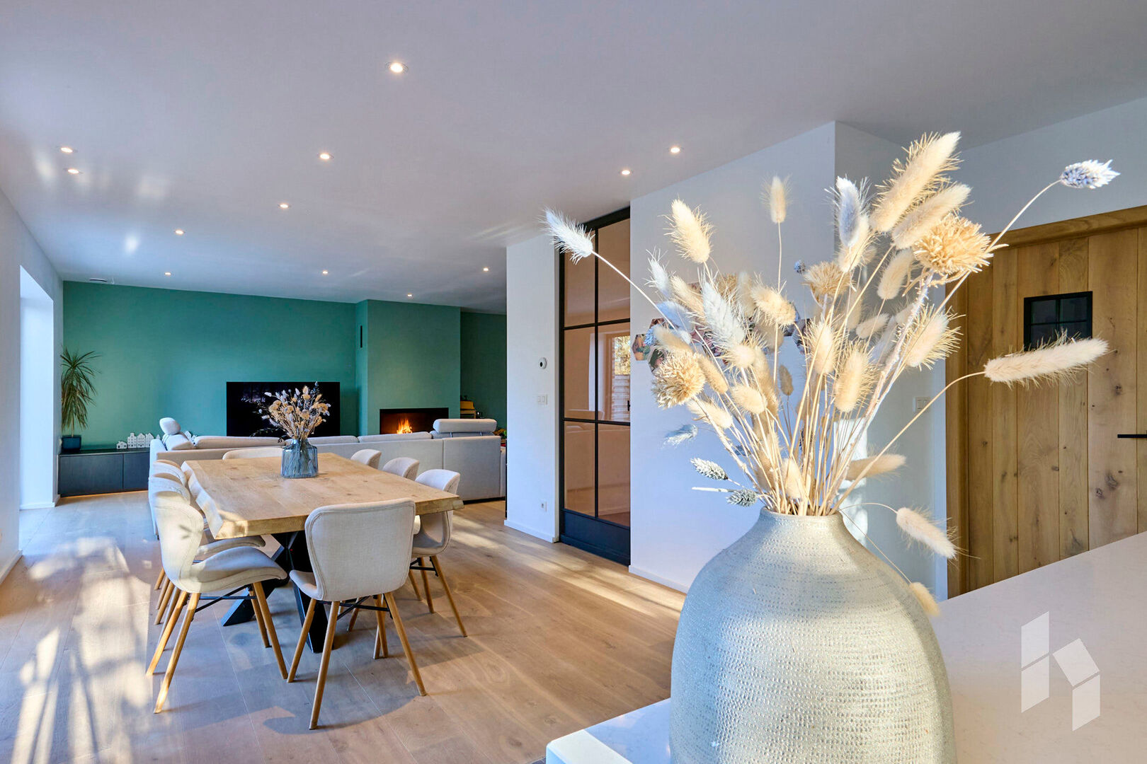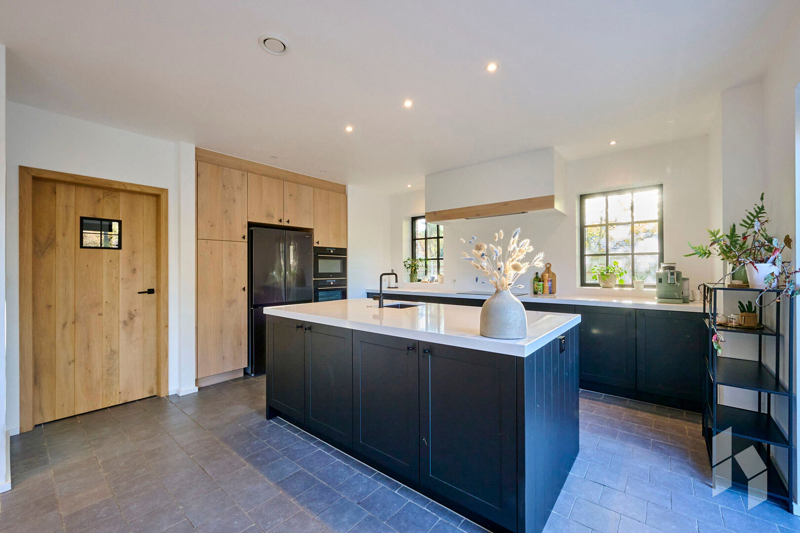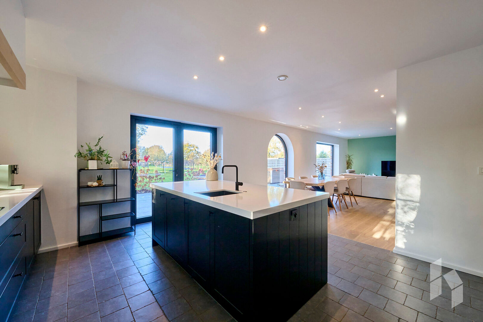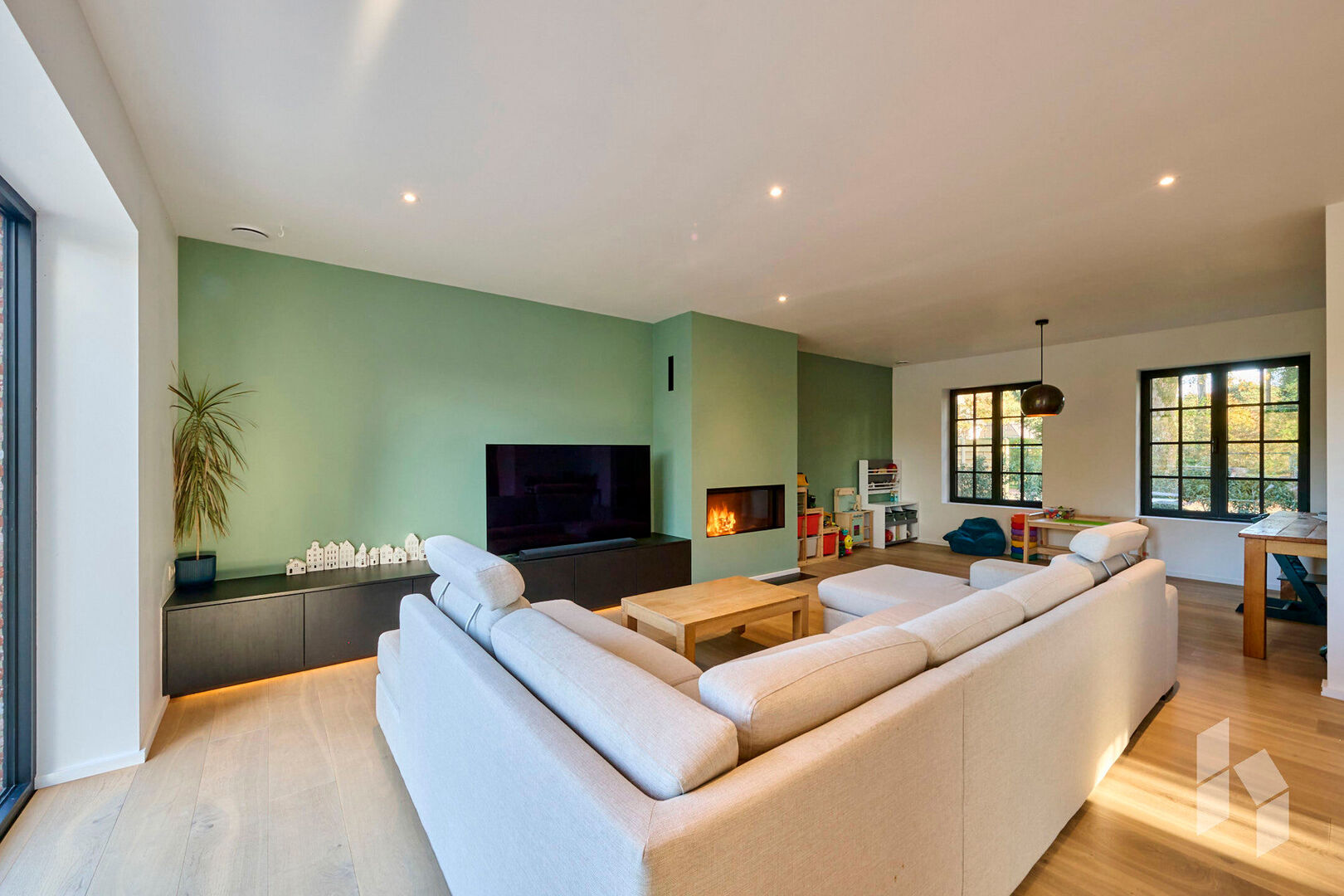 Via de inkomhal kom je terecht in de open, lichtrijke leefruimte, vanwaar je overal een zicht hebt op de ruime tuin achteraan. Er is in de woonkamer een gezellige houthaard voorzien en ook een apart gedeelte om eventueel in te richten als bureau. In het midden van de ruimte is er de eetkamer die uitgeeft op de prachtige, landelijke keuken - de eyecatcher van deze woning! Gelijkvloers is er dan nog een apart toilet en een berging.
