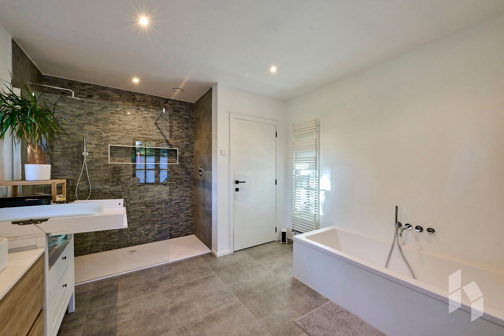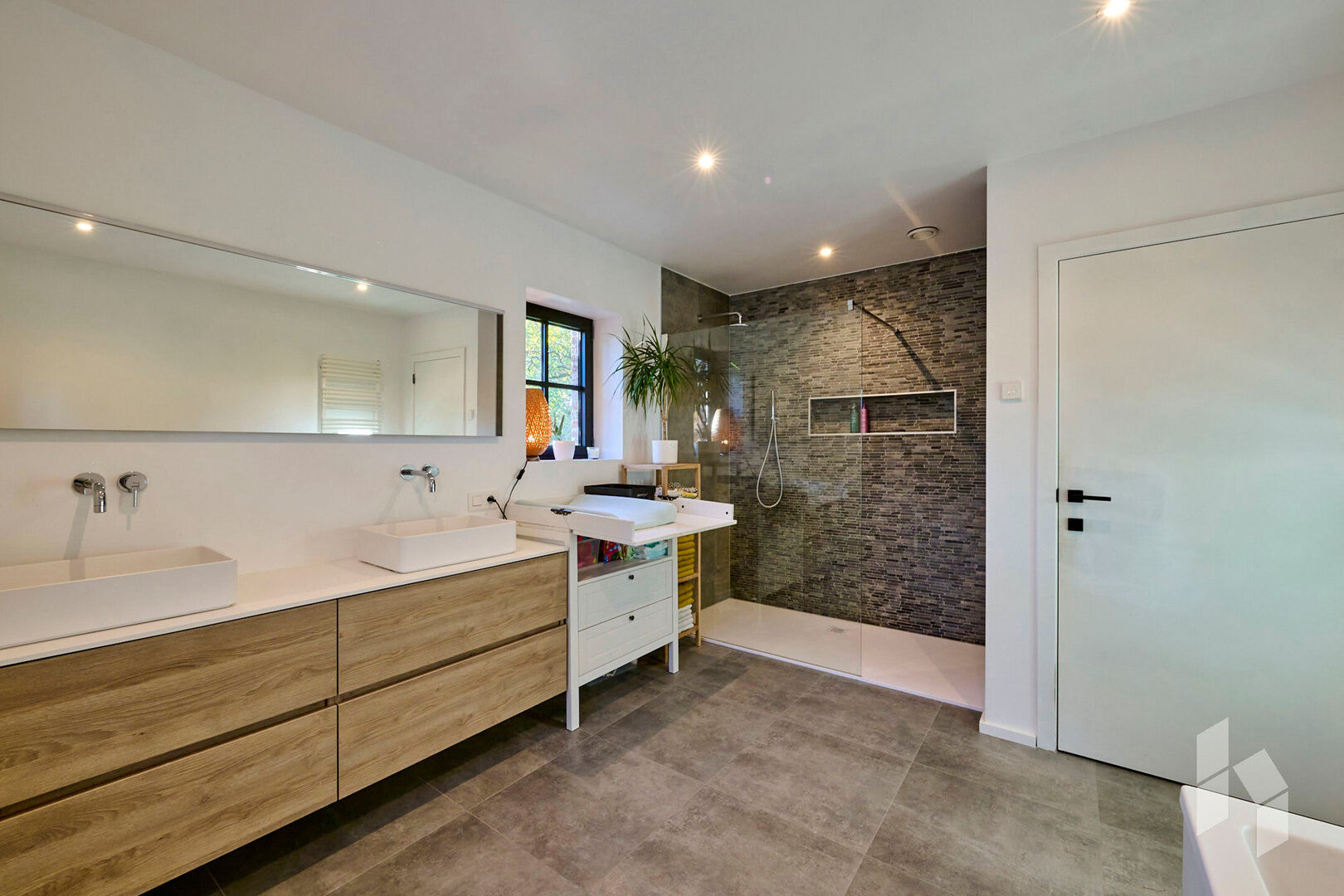 Verder is er een badkamer met bad, douche en dubbele lavabo, alsook een wasplaats met maatkasten en een apart toilet aanwezig.