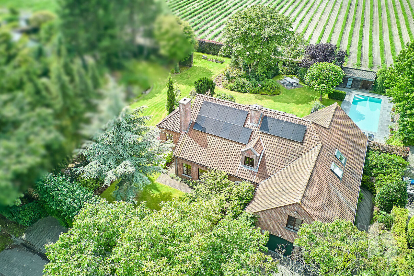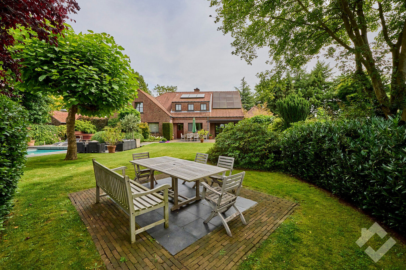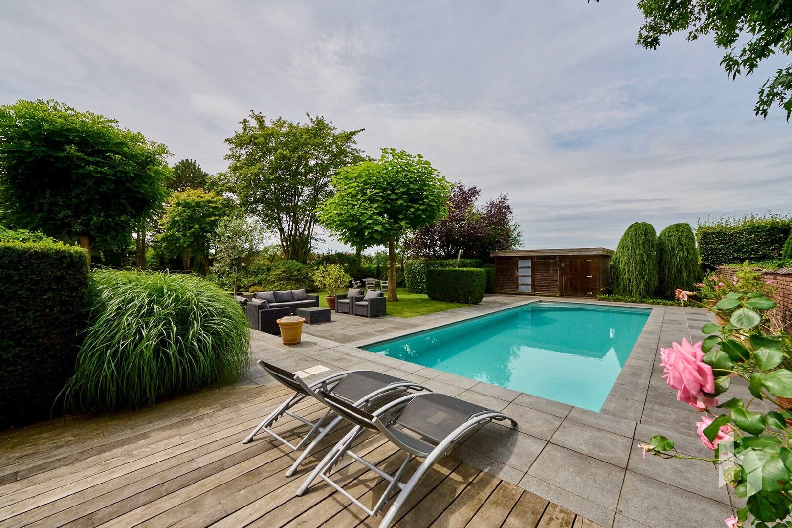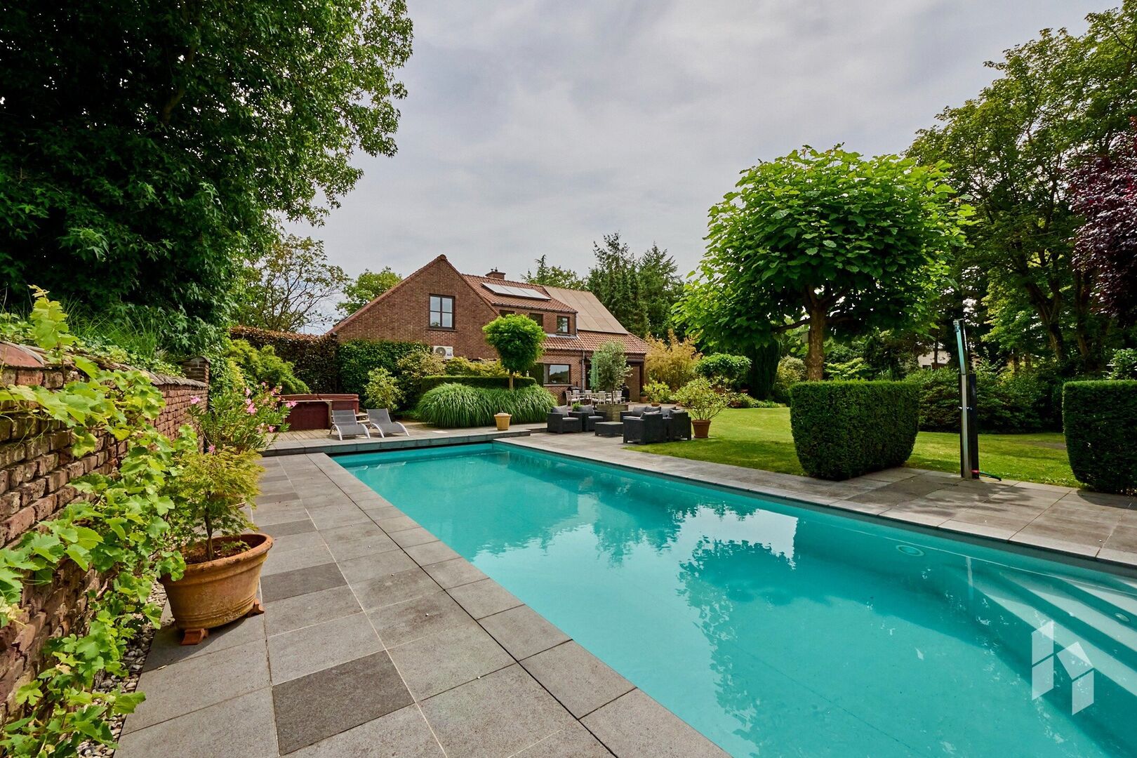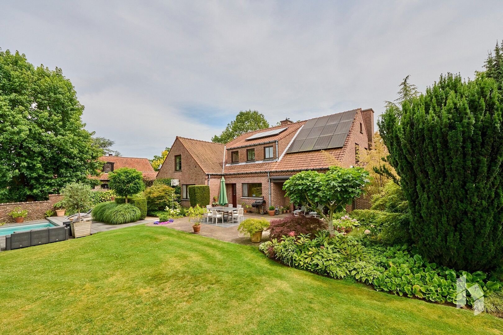 Buiten is het heerlijk vertoeven in de prachtig aangelegde tuin uitgerust met 4 terrassen, elk met een eigen uitzicht op de tuin die de mogelijkheid geven om zowel overdekt te zitten, als ingesloten of onder de bomen. Als troef is er dan ook nog een mooi zwembad dat zorgt voor de nodige verfrissing en ontspanningsmomenten.