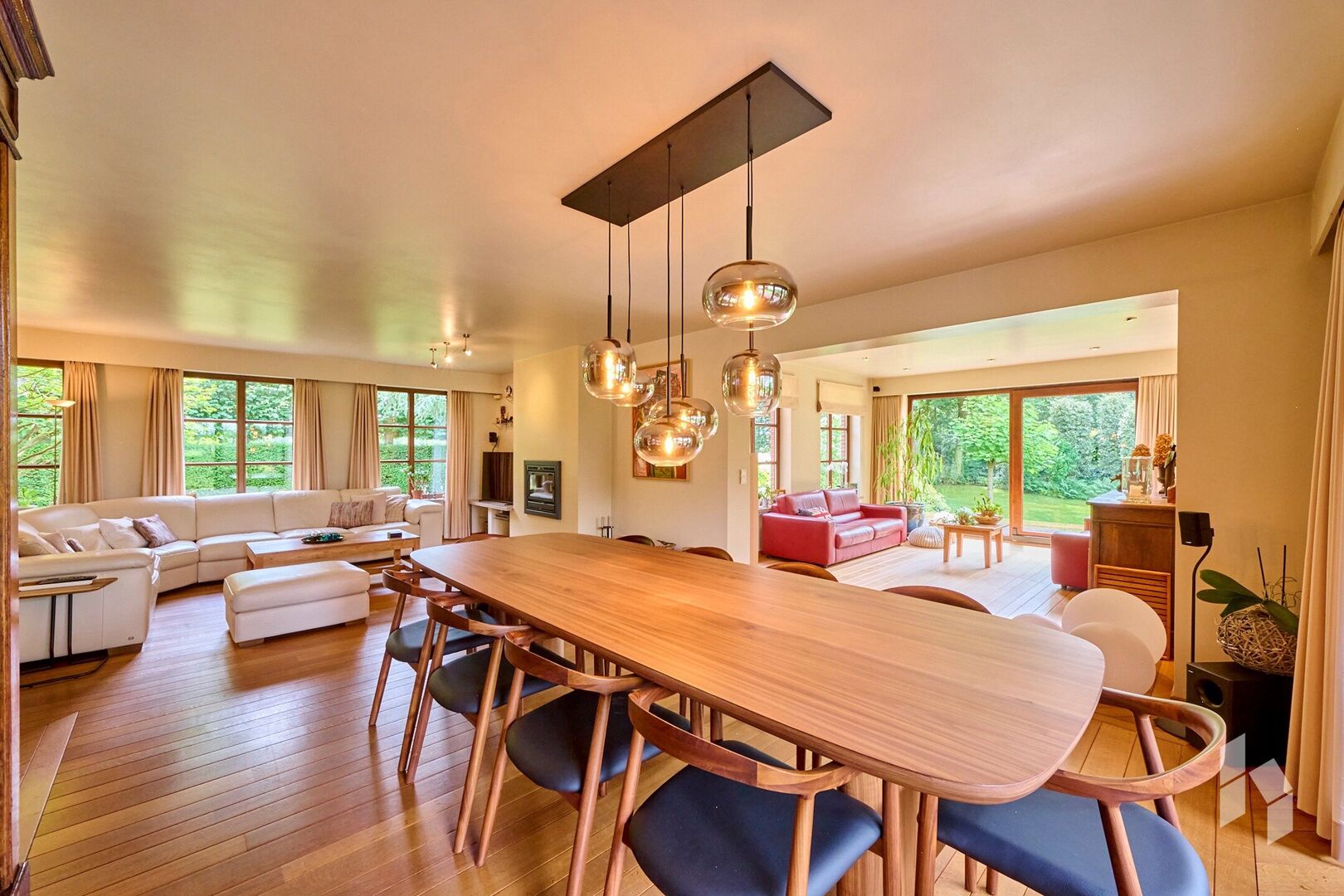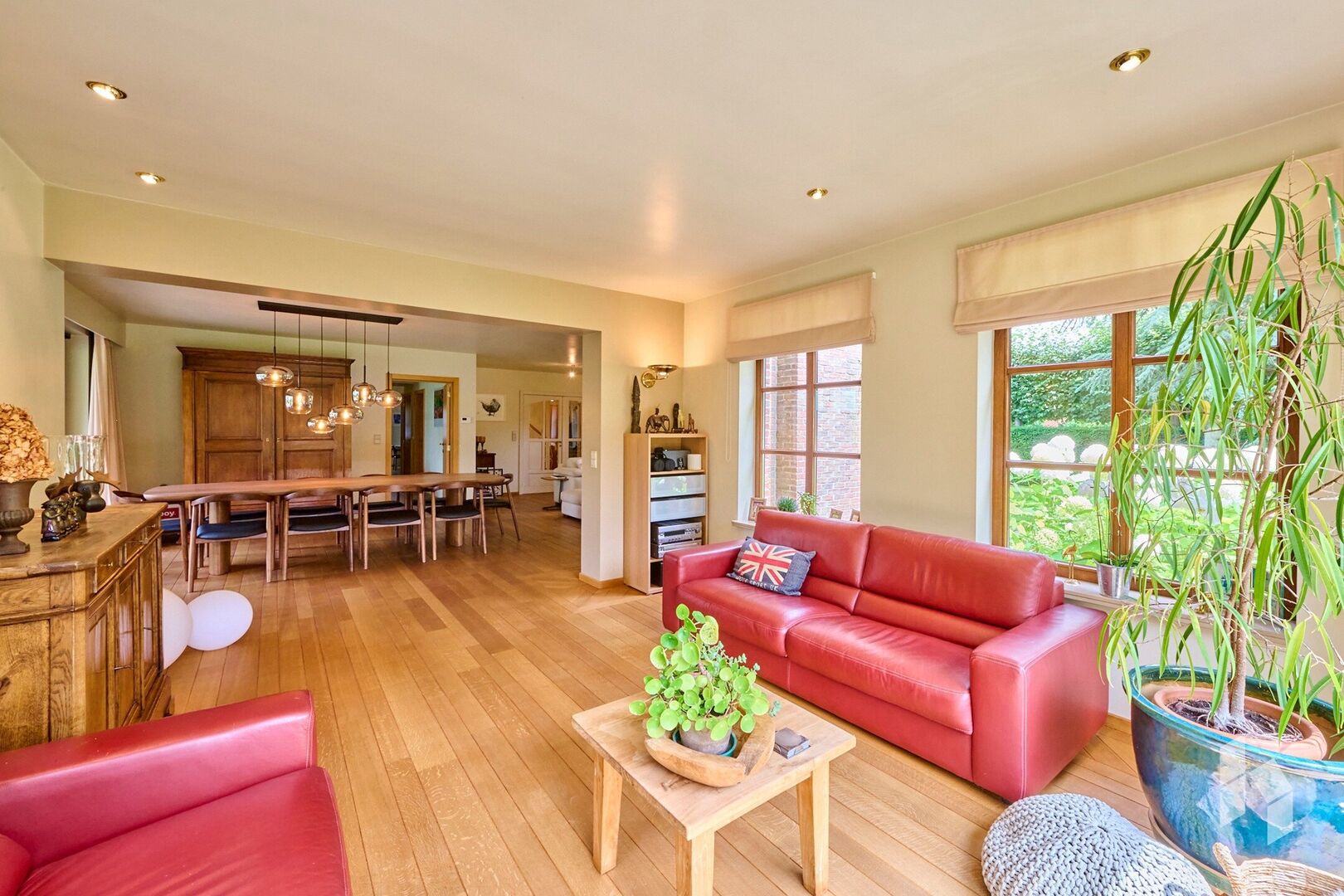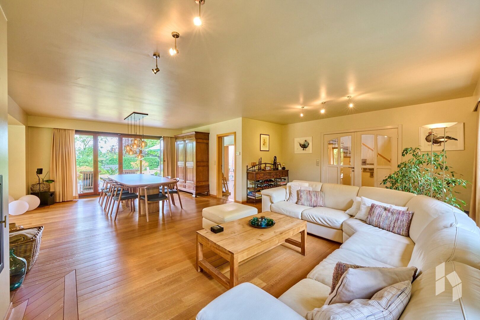 De ruime woonkamer is ingedeeld in twee zitgedeeltes en een eetkamer, met overal veel lichtinval. Via een grote raampartij is er toegang tot het overdekt terras.