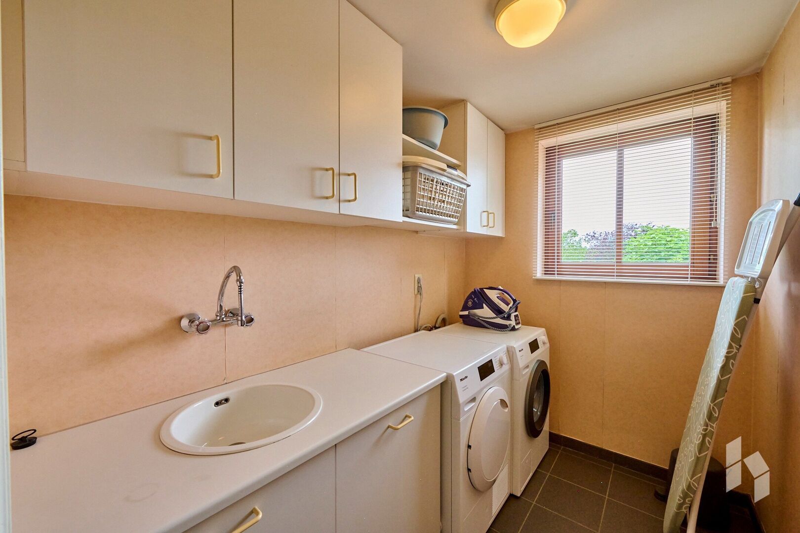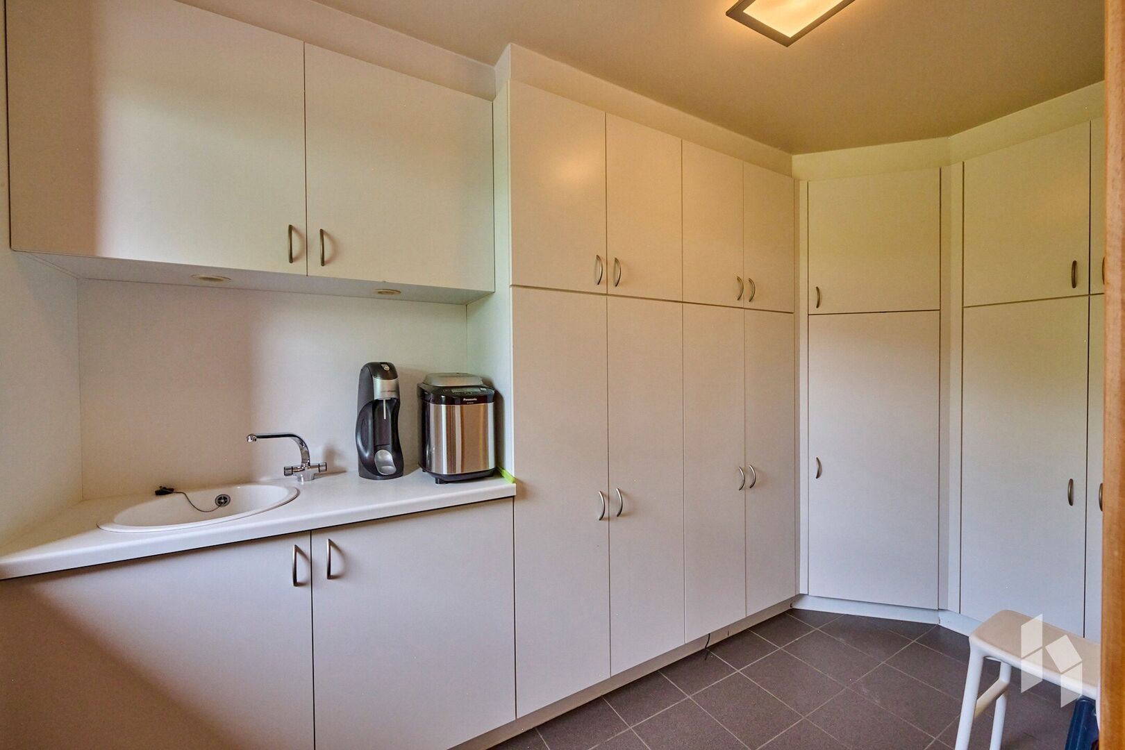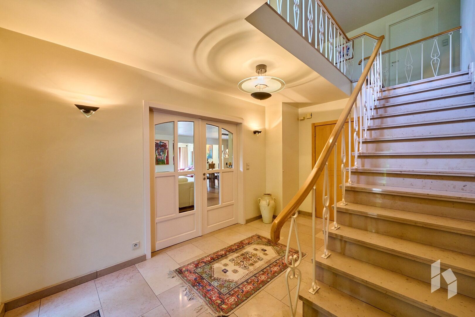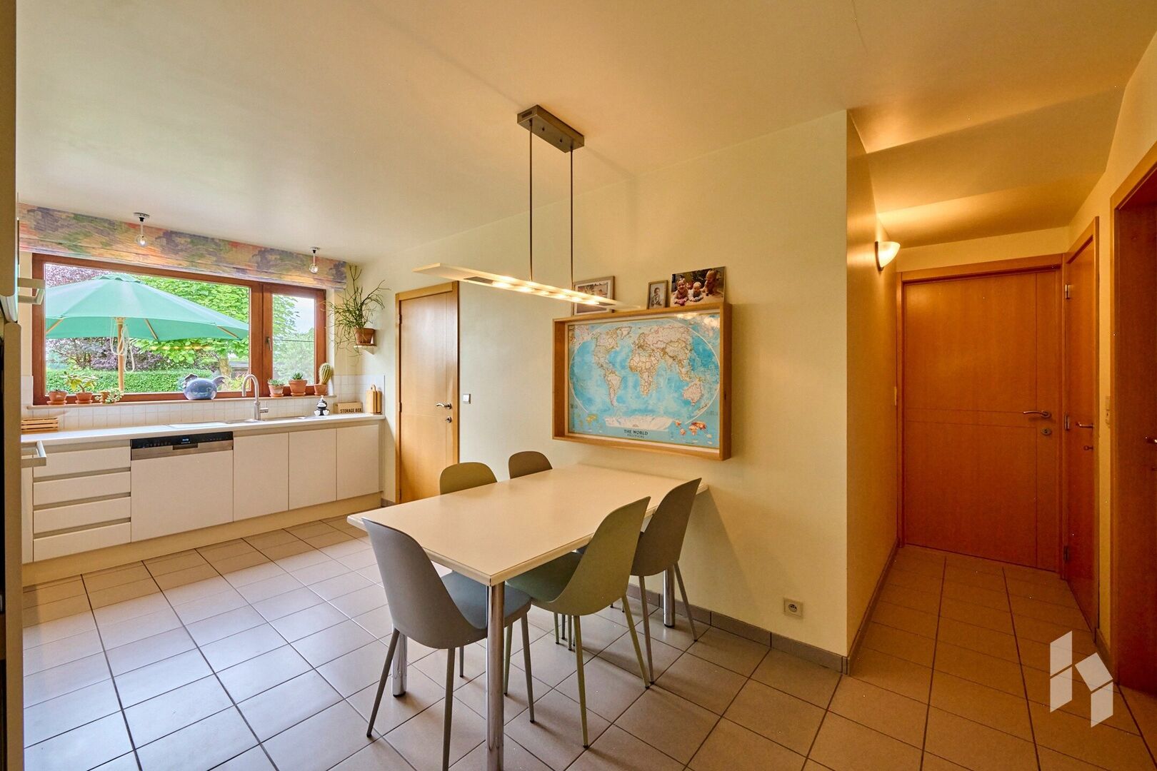 Verder is er op de gelijkvloerse verdieping een keuken met bijkeuken, een apart toilet in de inkomhal en een dubbele inpandige garage.