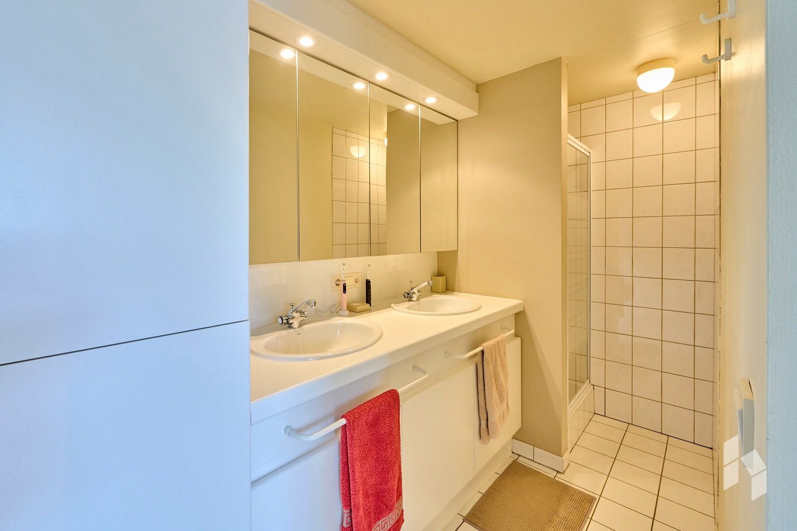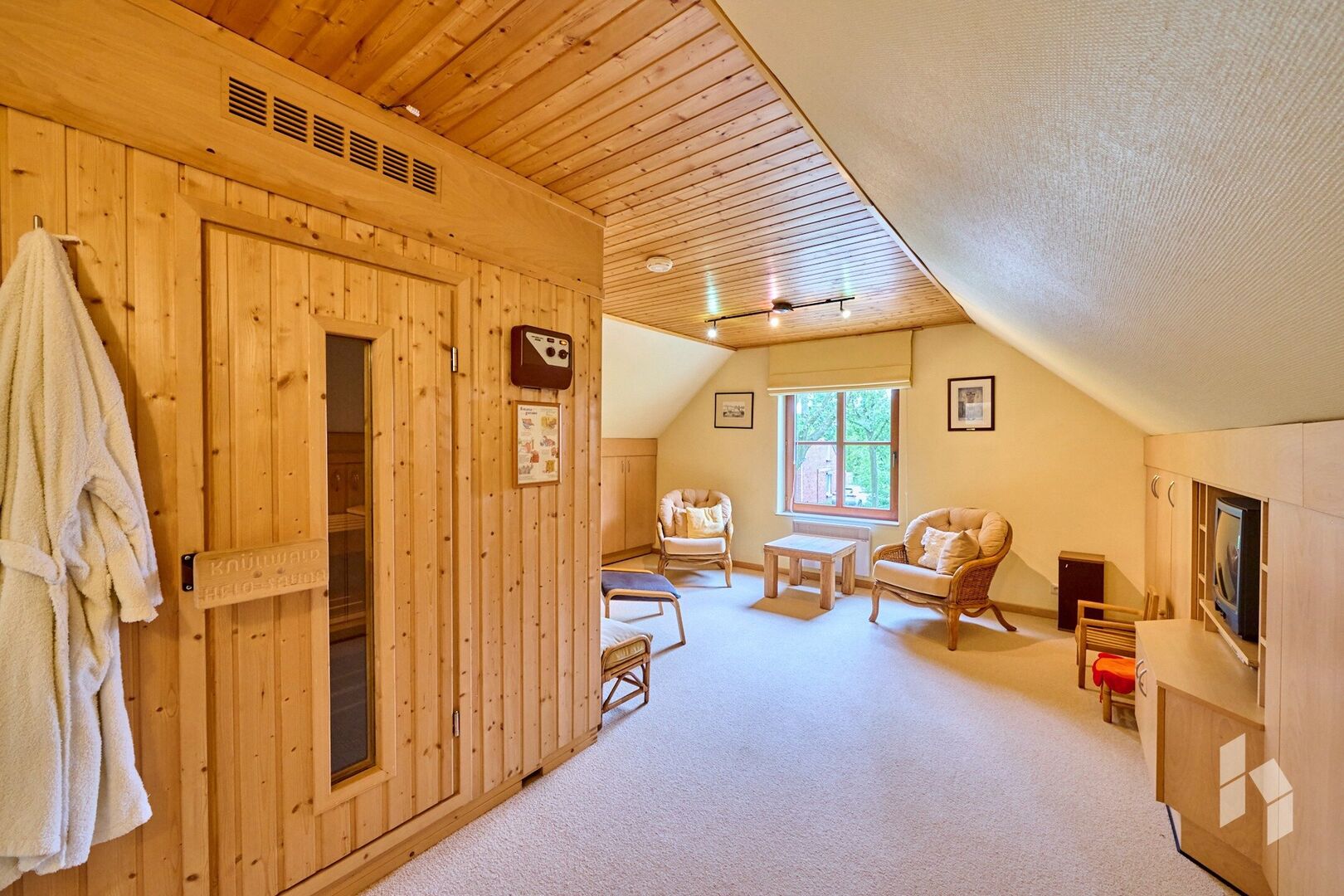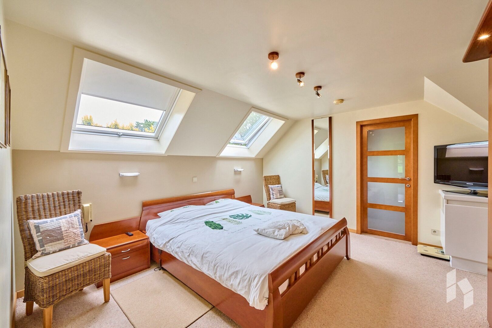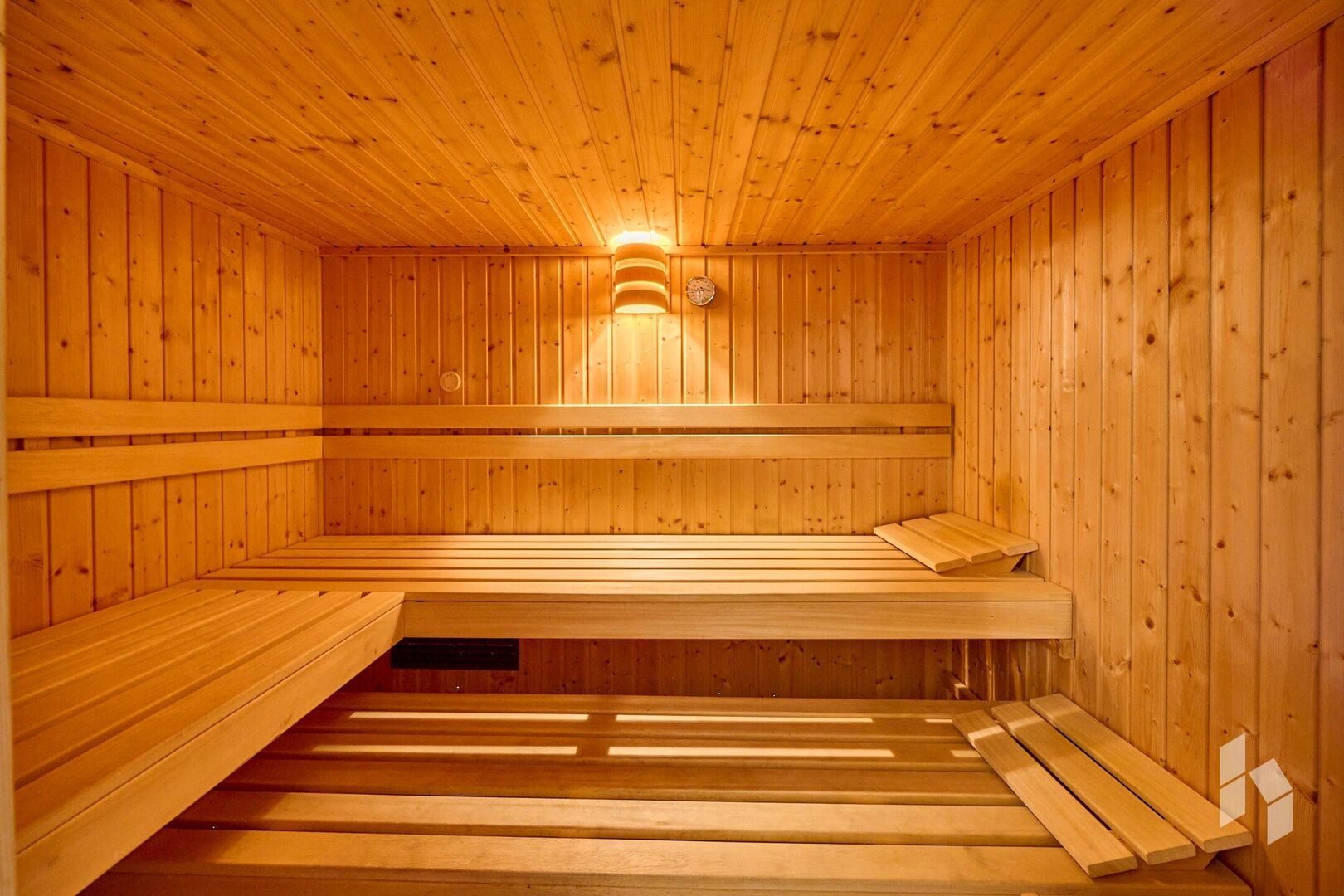 De master bedroom beschikt over een aangrenzende badkamer met dubbele lavabo en douche. Eén van de kamers is bovendien uitgerust met een sauna.